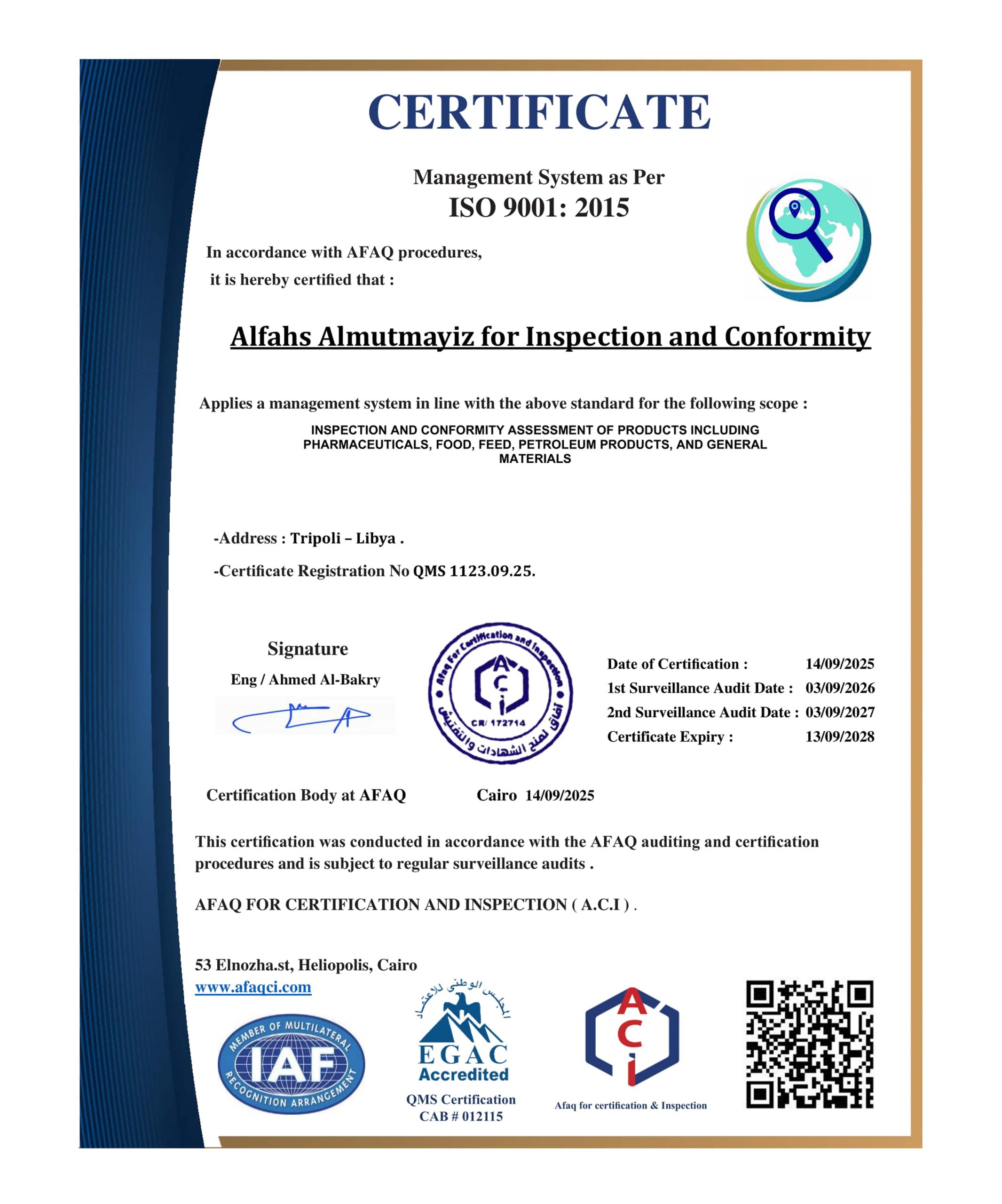 Alfahs Almutmayiz for Inspection and Conformity Company is a leading Libyan institution providing inspection and compliance services for the trade and industry sectors. We are committed to transparency, accuracy, and complete impartiality in all our reports. We specialize in quality and quantity control of goods across various sectors (pharmaceuticals, oil, food, and general materials) to ensure compliance with international standards from the point of origin to delivery.